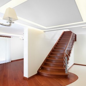 The M-107 wooden stairs are placed on the concrete. The concrete structure is massive and extremely stable. The overall lightness is added by the railing. The bars are made of strong, carefully selected stainless steel that fits perfectly with the wooden handrail.