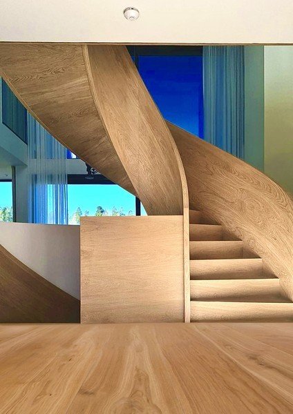 Konstrukcja: schody pełne, zabudowane od spodu tzw. "niebo"Balustrada: drewniana pełna, giętaDrewno: dąb naturalny, lakier półmat