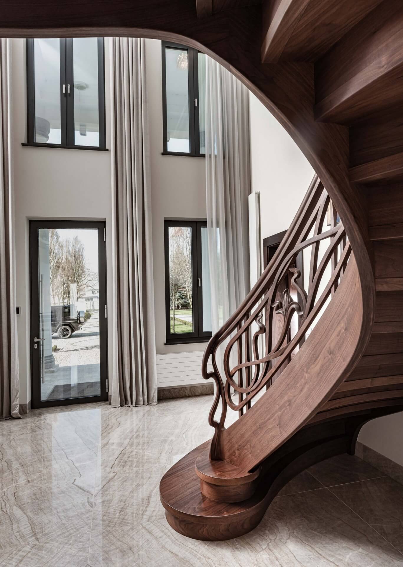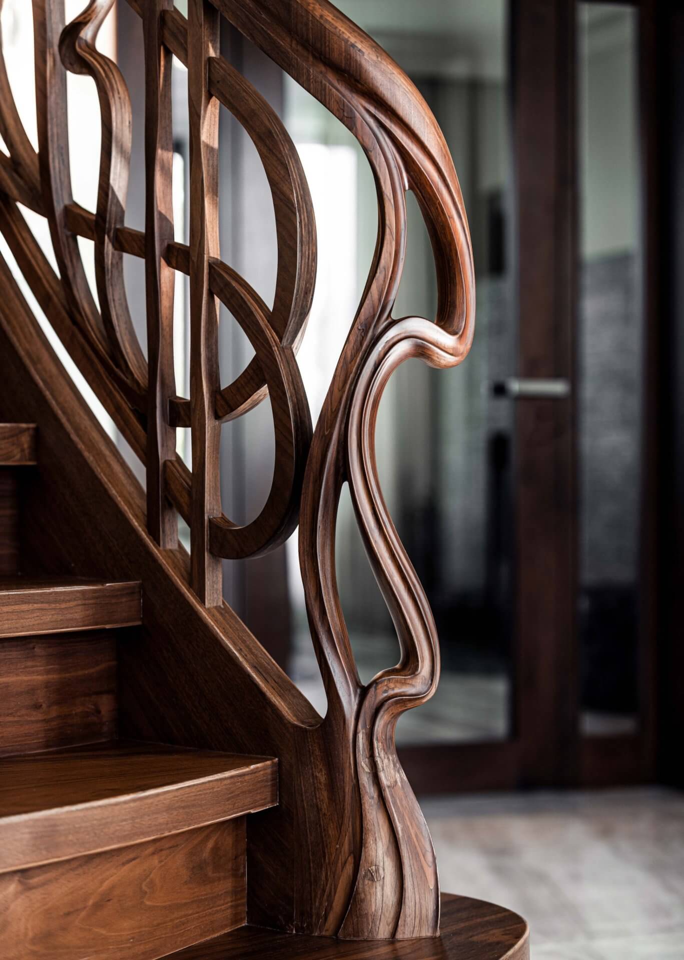 Konstrukcja: policzkowa z podstopnicamiBalustrada: rzeźbiona ręcznie secesjaDrewno : orzech amerykańskiWykończenie: lakier półmat