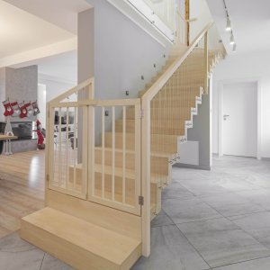 Konstrukcja: stopień-podstopień ZETABalustrada: linki stalowe + poręcz drewnianaDrewno: grabDodatkowo: bramki zabezpieczające z grabu